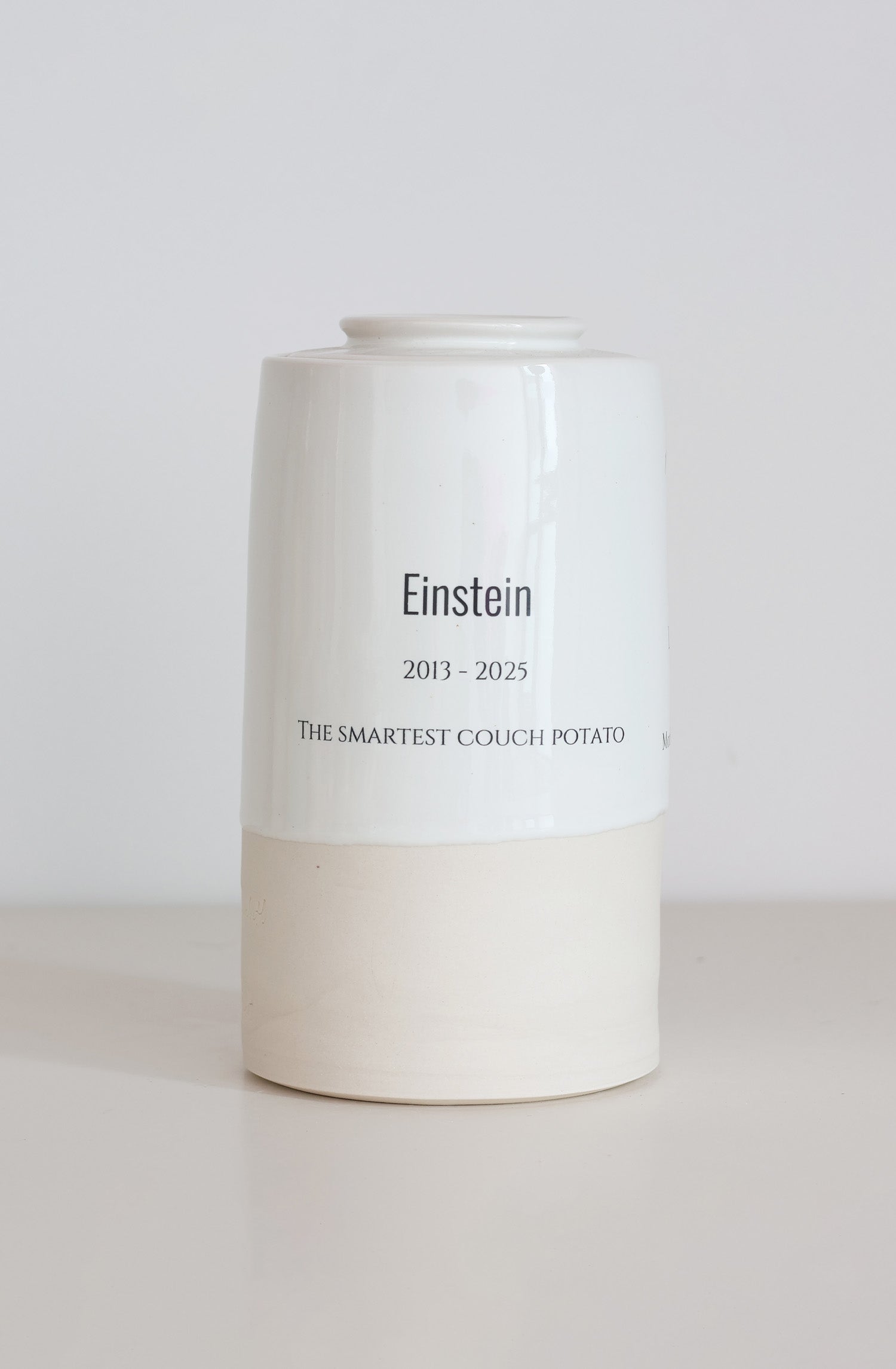 Size extra large tall custom with your choice of text, stamp, fonts, and upload your own paw print image. Personalized dog or cat pet urn for ashes.