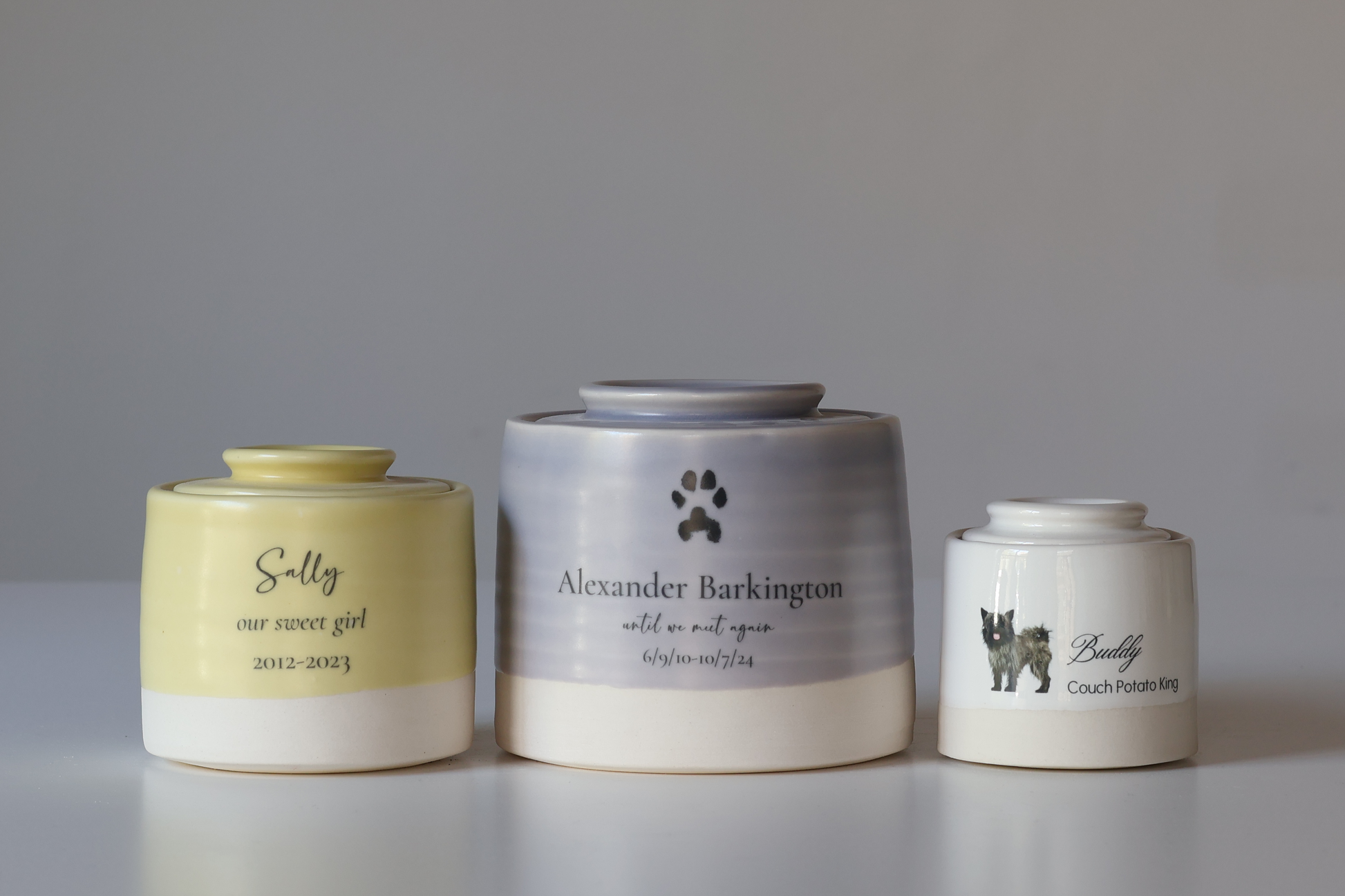 please feel free to contact me with questions on availability or customizations. the urns are all handmade, and we might be able to take additional customization requests for the text, but not for the stamps or glazes.